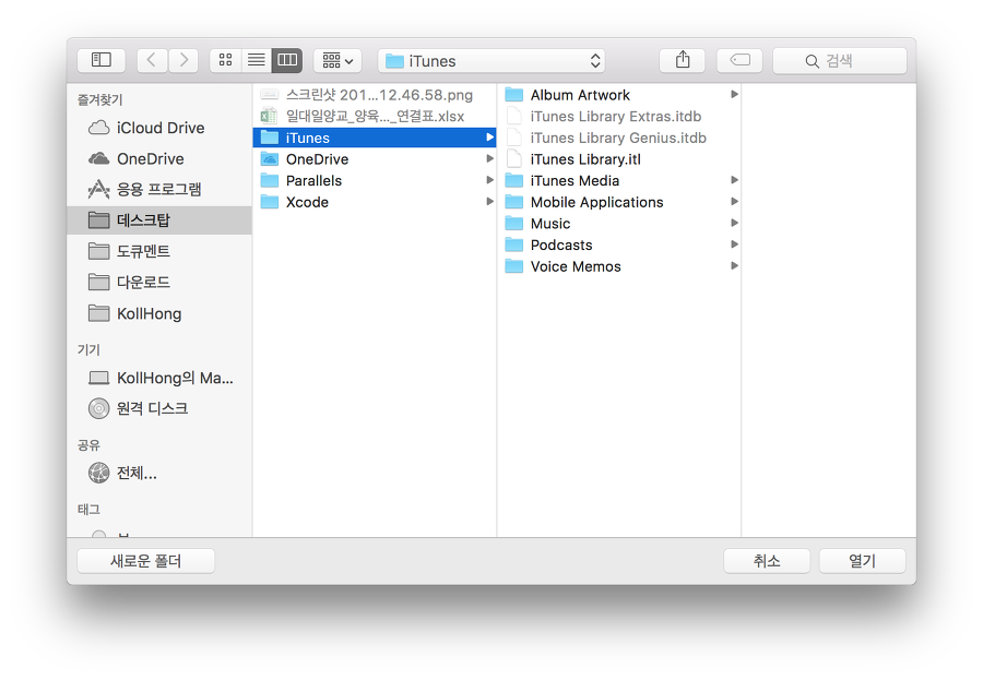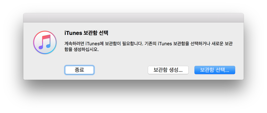 보관함의 기본 위치는 /Users/(사용자 폴더)/Music/iTunes입니다.