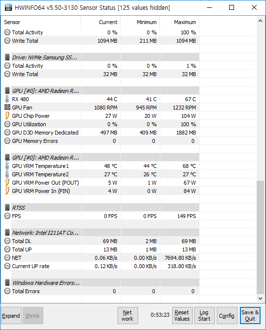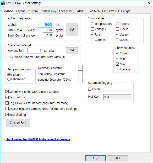 그래서 HWiNFO64에서 따로 설정해야 가독성이 높아지고 리소스 사용이 감소합니다.