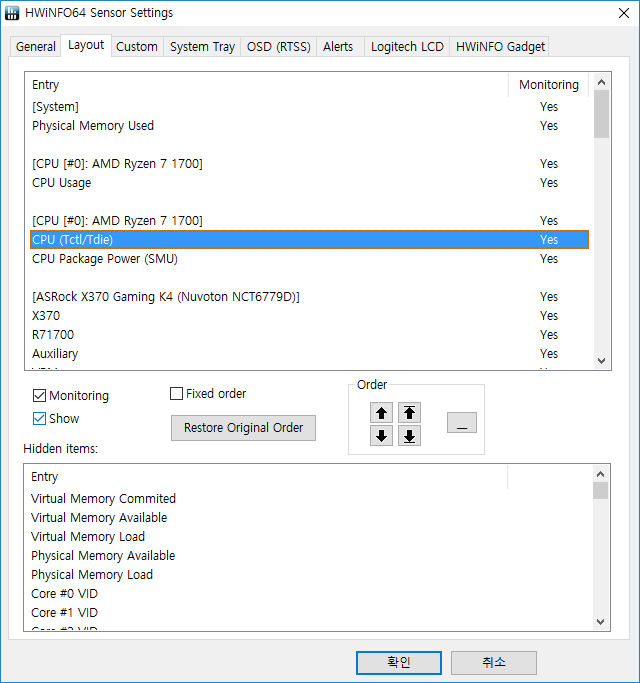 저는 CPU열 첫 번째에 CPU온도를 표시할 것이기 때문에 메인보드에서 리포트하는 CPU온도의 이름을 CPU이름으로 바꿨습니다.
