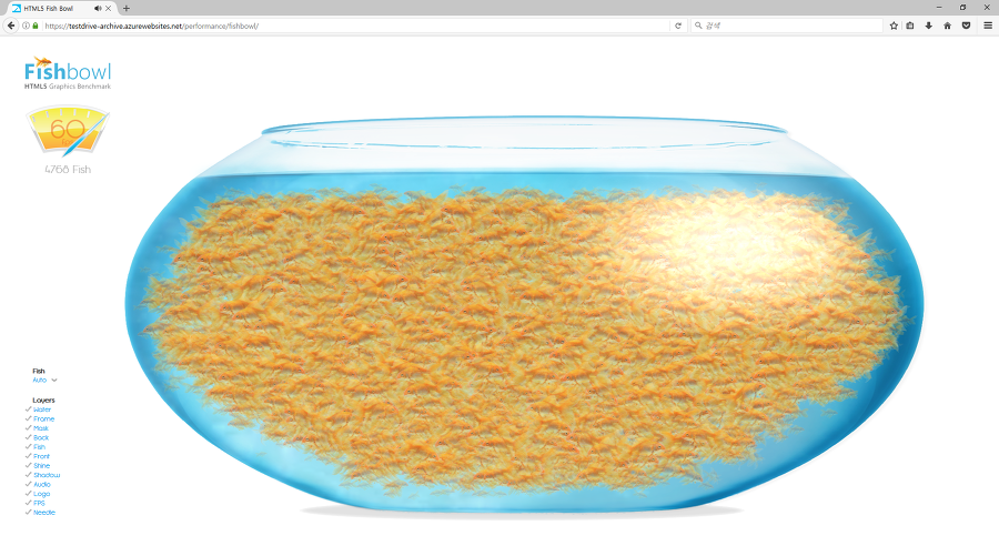 다만 Chrome을 사용하다가 Firefox설치 후에 체감속도가 상당히 좋아 Fishbowl 테스트 해보니 HTML5에서도 차이가 나타났습니다.