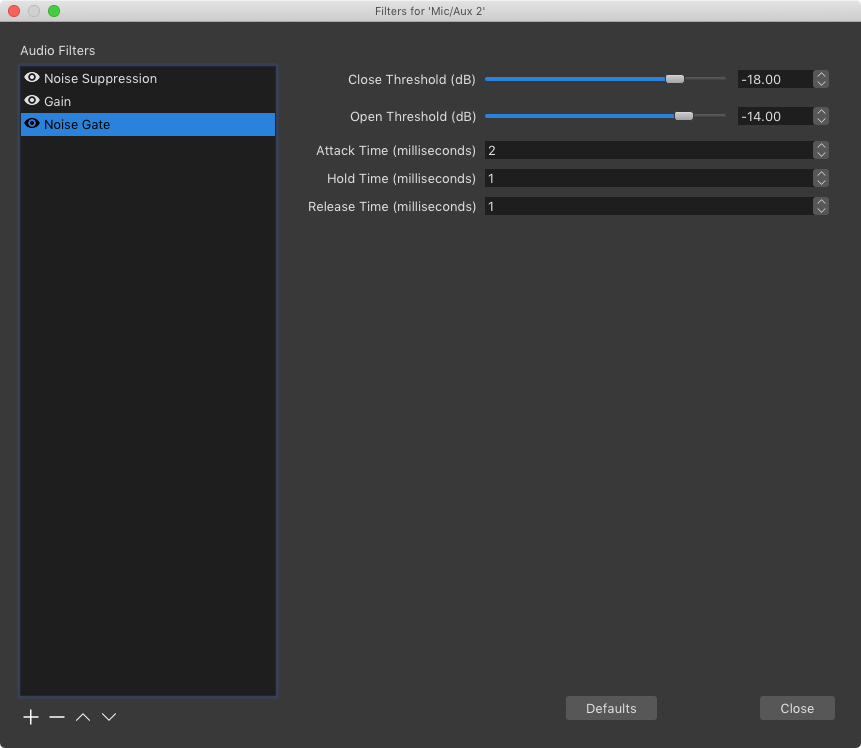 오디오를 위해서는 노이즈 게이트, 컴프레서 등이 있다. 노이즈 게이트는 사용자가 지정한 음성의 크기를 기준으로 그보다 더 작은 소리는 아예 출력하지 않는다. 컴프레서는 기준값 이상의 소리를 줄이는데, 갑자기 큰 소리를 내거나 물건이 떨어지는 소리처럼 예상하지 못한 큰 소리가 날 때 출력을 줄여 컨텐츠 소비자가 불편하지 않게 해준다.