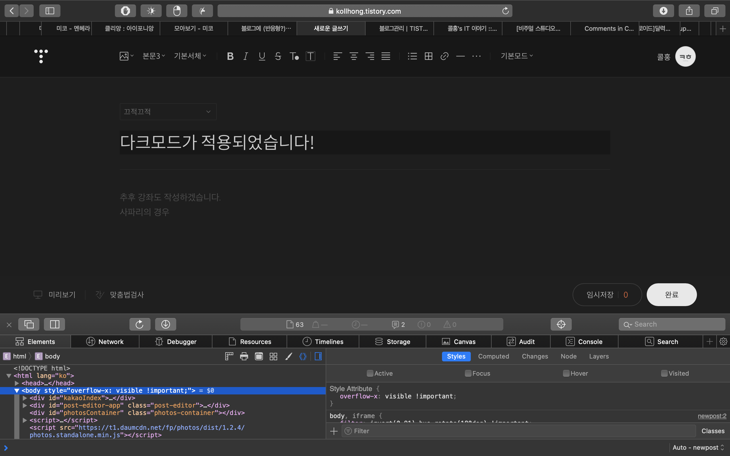 사파리의 경우 아래와 같은 개발자 모드 화면에서 다크모드를 강제로 켜거나 끌 수 있습니다.