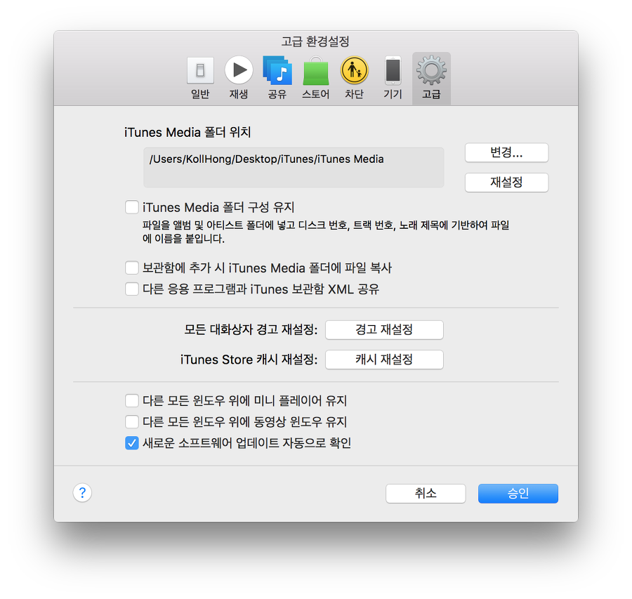 보관함의 기본 위치는 /Users/(사용자 폴더)/Music/iTunes입니다.