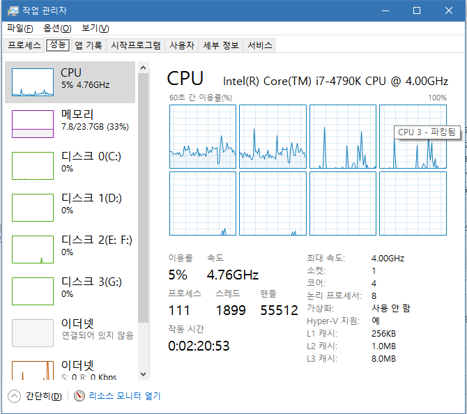 지금 블로그 작성하는 동안에는 첫번째 코어와 그의 하이퍼쓰레딩만 활성화되어 있습니다.