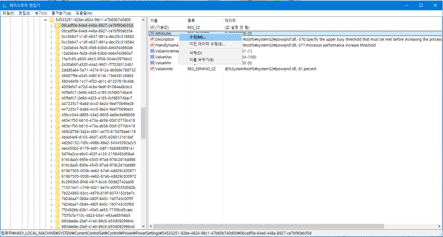 위에서 작성한 대로 레지스트리 편집기를 통해 프로세서 전원 관리 부분에 들어갑니다.