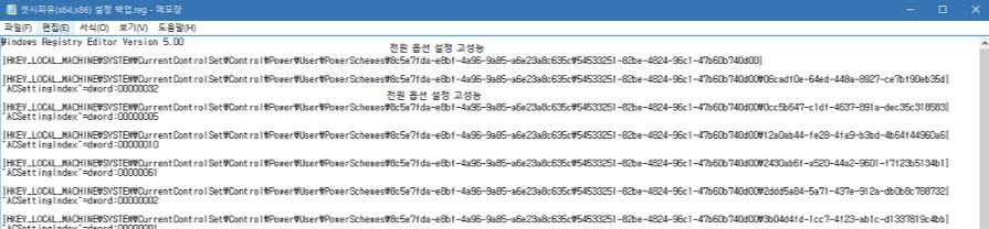 설정이 저장된 곳은 전원 옵션에서 설정이 보이게 하는 레지스트리(기존 글의 첫번째 파일)와 다른 위치에 있습니다.