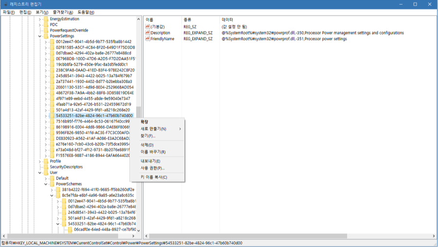 그 중에 54533251-82be-4824-96c1-47b60b740d00 안에 있는 것들이 프로세서 전원 관리 부분의 내용입니다.
