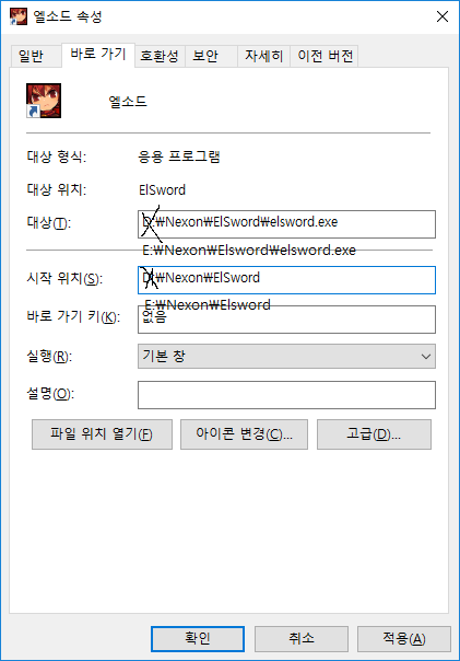3) 프로그램 폴더를 옮겼으면 바로가기 파일을 변경합니다.