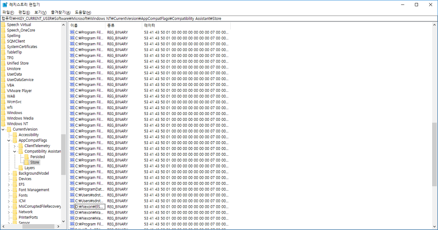 Tip:사진의 레지스트리 키 값은 Microsoft 디렉터리 하위의 Compatibility Assistant에 있기 때문에 Windows에서 호환성 변수를 저장하기 위해 만든 키인 것을 알 수 있습니다. 수정하지 않고 삭제해도 무방합니다.