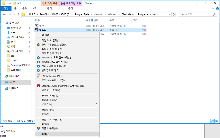 나타난 바로가기에서 마우스 오른쪽 버튼을 클릭하고 속성을 누릅니다.