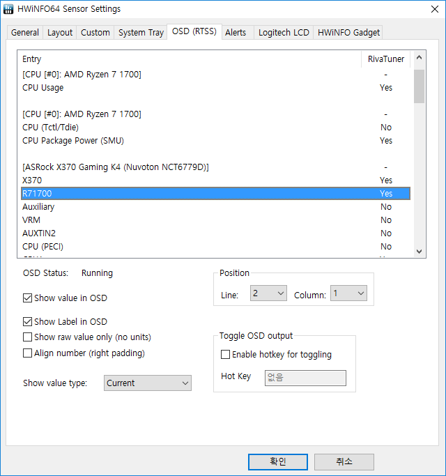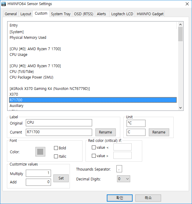 저는 CPU열 첫 번째에 CPU온도를 표시할 것이기 때문에 메인보드에서 리포트하는 CPU온도의 이름을 CPU이름으로 바꿨습니다.
