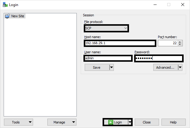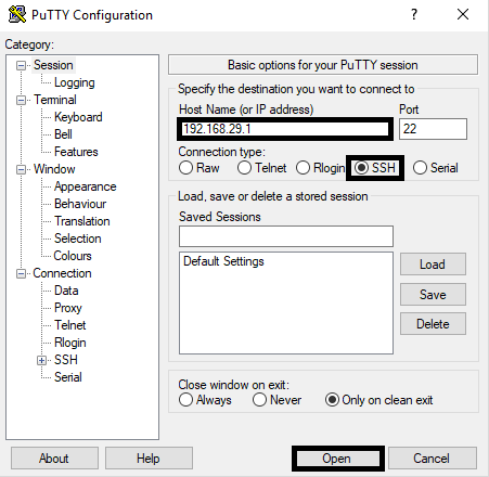 Host Name에 12.168.29.1 입력 Port는 22, Connection type은 SSH이고, 기본으로 입력되어 있다.
