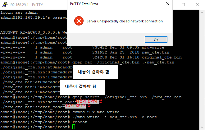 new_cfe.bin과 mtd-write 파일을 라우터에 복사