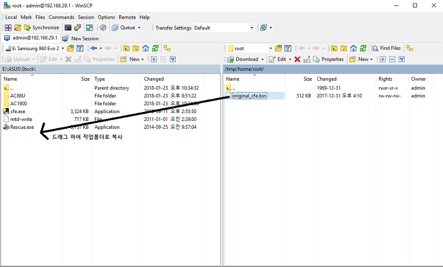 WinSCP에서 오른쪽 Pane에 있는 original_cfe.bin을 왼쪽 Pane으로 드래그한다.