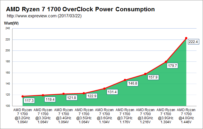 세번째는 논리가 아닌 경험적 근거이다. 필자의 CPU는 아래 라이젠의 소비전력 그래프와 거의 비슷한 수율을 가지고 있는데, Cooling 능력이 65W인 쿨러로 3.6Ghz까지 문제없이 오버클럭이 된다. 하지만 그래프를 통해 알 수 있듯이 소비전력은 130W 가까이 된다. TDP가 소비전력과 관계가 있다고 보기에는 그 차이가 크다.