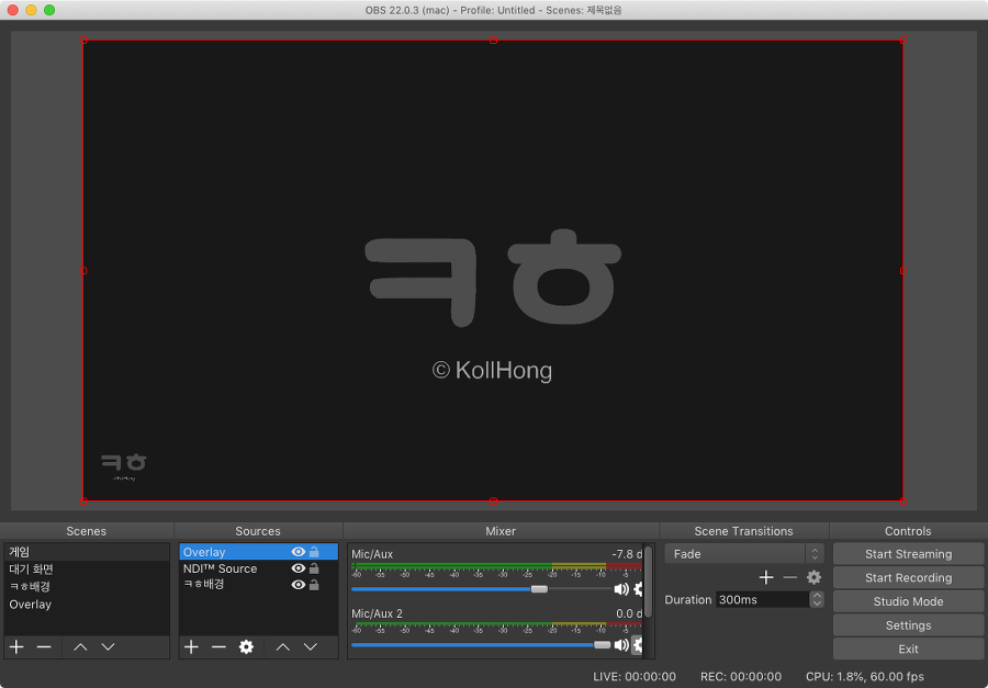 또한 소스에는 장면도 추가할 수 있는데, 위 스크린샷에서 Overlay와 ㅋㅎ배경은 장면을 추가한 것이다.