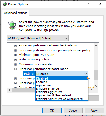 - 나타나는 창에서 '프로세서 전원 관리' -> 프로세서 성능 향상 모드(영문OS를 사용 중이기 때문에 한글 표현은 다를 수 있습니다.)로 이동합니다.