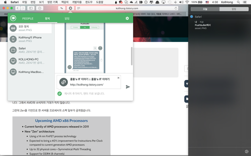 Pushbullet는 텍스트 전송과 파일 전송이 쉽고, 안드로이드 iOS, Windows 대표적인 OS는 모두 지원한다. Mac의 경우는 Safari확장기능과 PushPal(유료)라는 3rd party 앱을 사용하면 된다. 크롬과 파이어폭스, 오페라브라우저도 지원한다.