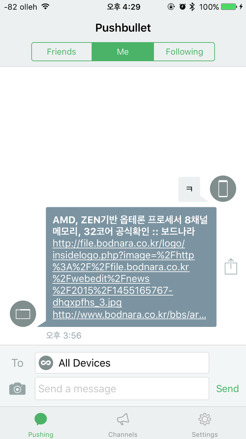 아래 사진은 PushBullet계정에 안드로이드를 연결했을때의 장면이다.